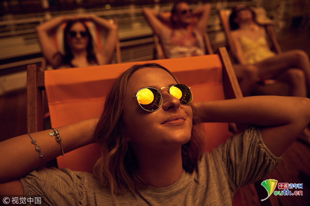 當(dāng)?shù)貢r(shí)間2018年9月18日,英國(guó)曼切斯特,顧客們?cè)谔乩5沦徫镏行牡囊粋€(gè)巨型的“太陽”下享受室內(nèi)日光浴,感受英國(guó)未完的史上最熱夏天。這個(gè)人造“太陽”的亮度相當(dāng)于1.2萬個(gè)燈泡。圖片來源:視覺中國(guó)