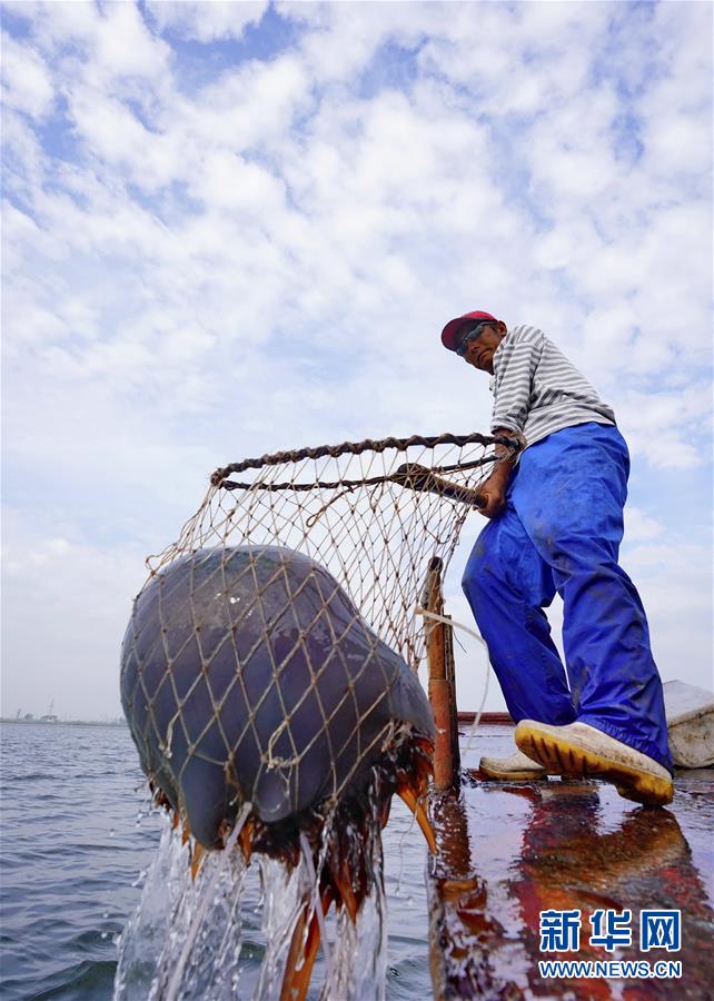 9月21日,灤南縣南堡鎮(zhèn)南堡二村一家海蜇養(yǎng)殖場(chǎng)的工人在養(yǎng)殖區(qū)打撈海蜇。新華社記者楊世堯攝