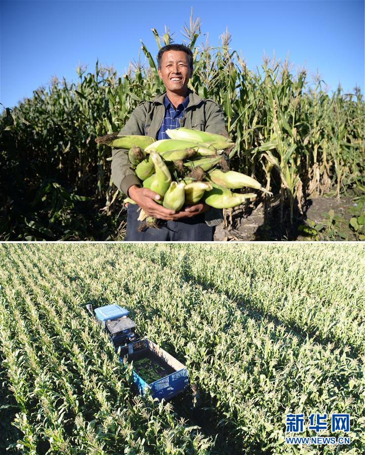 這張拼版照片顯示的是:上圖,9月18日,黑龍江省綏化市青岡縣禎祥鎮(zhèn)莊稼屯村民莊秀彬捧著剛收獲的玉米;下圖,9月18日,莊秀彬駕駛農(nóng)機收獲玉米(無人機拍攝)。 新華社記者王凱攝