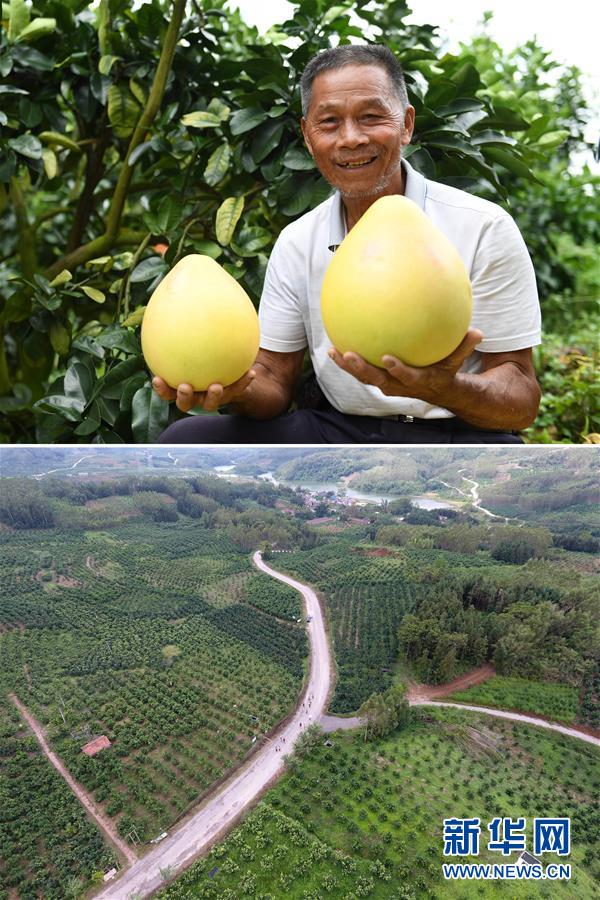 這張拼版照片顯示的是:上圖,9月18日,廣西武宣縣東鄉(xiāng)鎮(zhèn)風沿村村民陳紹桂展示剛采摘的蜜柚;下圖,9月18日,人們在風沿村三紅蜜柚種植基地內(nèi)行走(無人機拍攝)。 新華社記者陸波岸攝