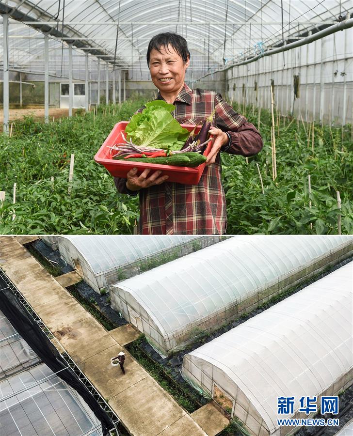 這張拼版照片顯示的是:上圖,9月20日,在江蘇省常州市鐘樓區(qū)鐘樓現(xiàn)代農(nóng)業(yè)產(chǎn)業(yè)園,菜農(nóng)邵新華展示剛采摘的蔬菜;下圖,9月20日,菜農(nóng)邵新華在農(nóng)業(yè)產(chǎn)業(yè)園的大棚旁搬運(yùn)蔬菜(無人機(jī)拍攝)。 新華社記者李博攝