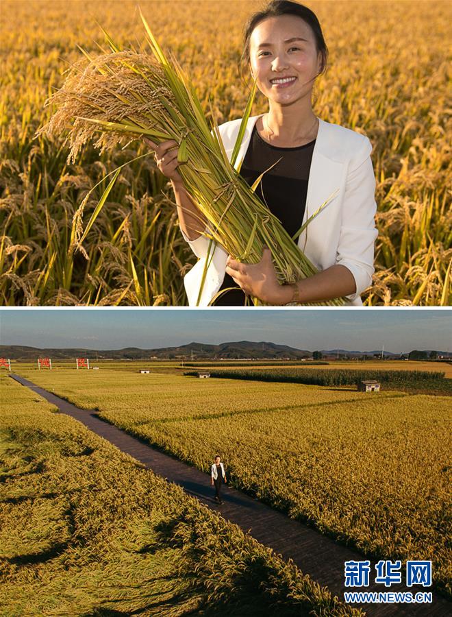這張拼版照片顯示的是:上圖,9月19日,在吉林省舒蘭市白旗鎮(zhèn)松江村,返鄉(xiāng)創(chuàng)業(yè)成立有機(jī)水稻合作社的蔡雪在稻田間捧著剛收割的早稻;下圖,9月19日,蔡雪行走在稻田間的棧道上(無人機(jī)拍攝)。