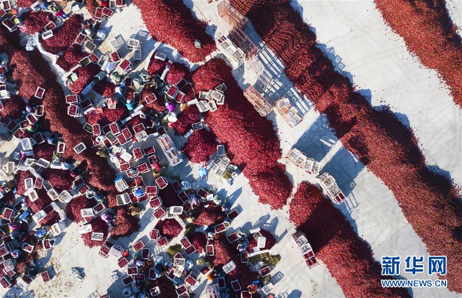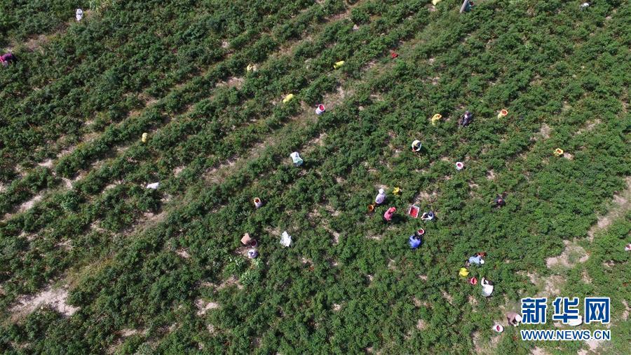 9月16日,阜城縣王集鄉(xiāng)南張莊村農(nóng)民在采摘辣椒(無人機(jī)拍攝)。近年來,河北省阜城縣王集鄉(xiāng)在推進(jìn)產(chǎn)業(yè)富民過程中,積極引導(dǎo)農(nóng)民調(diào)整農(nóng)業(yè)產(chǎn)業(yè)結(jié)構(gòu),按照品種特色化、種植規(guī)?;a(chǎn)銷一體化的“公司+基地+農(nóng)戶”的經(jīng)營模式,鼓勵(lì)農(nóng)民發(fā)展特色辣椒種植,推行“訂單種植”模式,開辟出了一條農(nóng)民創(chuàng)收新路徑。目前,阜城縣王集鄉(xiāng)辣椒種植面積3100余畝,每畝年收益2500元以上,帶動(dòng)當(dāng)?shù)剞r(nóng)民實(shí)現(xiàn)增收。新華社記者朱旭東攝