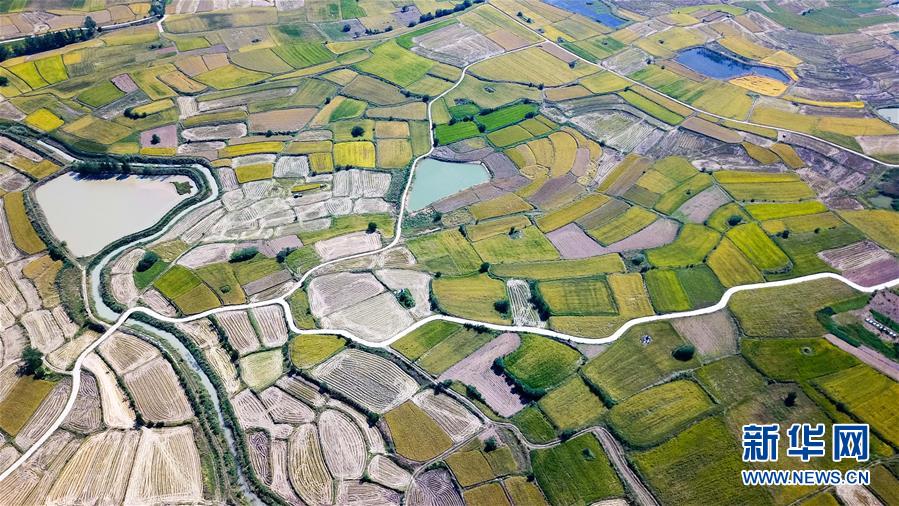 這是安徽鳳陽(yáng)小崗村稻田景象(9月27日無(wú)人機(jī)拍攝)。 新華社記者 張端攝
