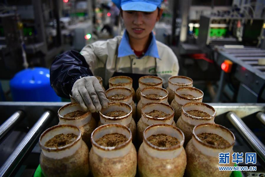 在位于清豐縣的河南龍豐實(shí)業(yè)股份有限公司,一名工人在裝瓶車間查看食用菌栽培瓶裝瓶情況(9月28日攝)。新華社記者馮大鵬攝