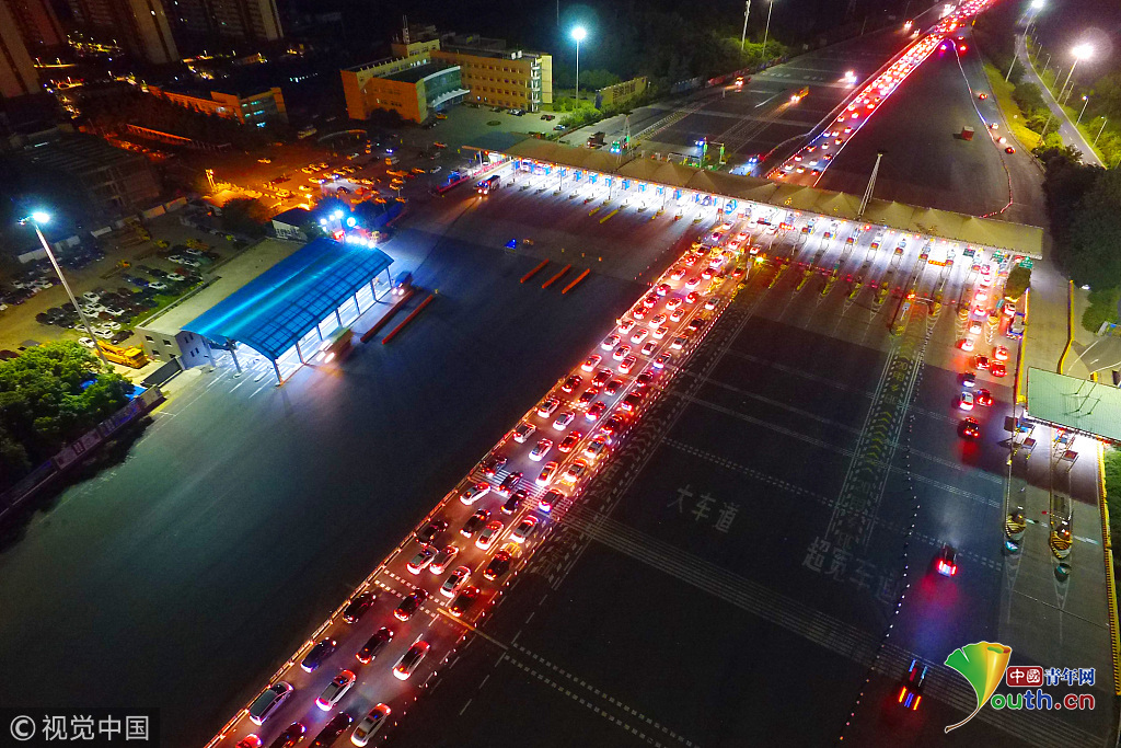2018年10月1日,國(guó)慶假期首日凌晨1點(diǎn)左右,南京迎來(lái)出行高峰,所有高速公路出城方向迎來(lái)大批車輛,航拍南京長(zhǎng)江二橋收費(fèi)站,大量車輛排起長(zhǎng)龍,場(chǎng)面尤為壯觀。圖片作者:方東旭