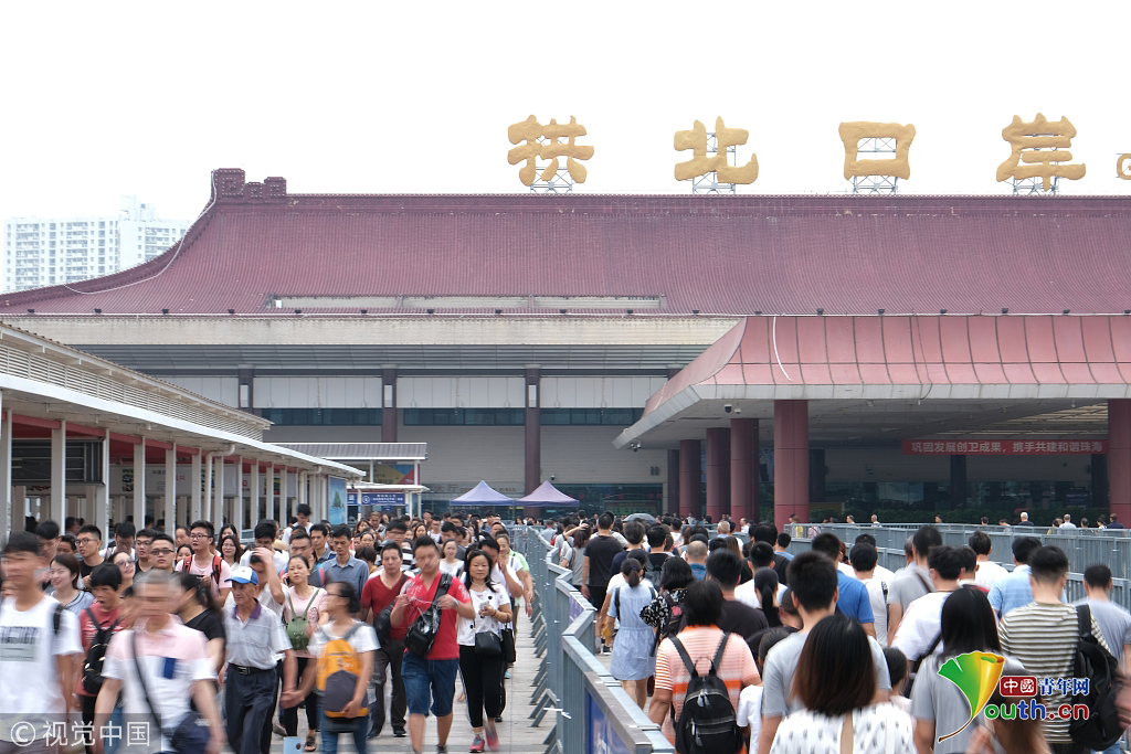2018年10月1日國慶節(jié),珠海拱北口岸迎來第一波過關(guān)的民眾,拱北口岸是中國人流量最大的陸地通關(guān)口岸。圖片作者:潘力