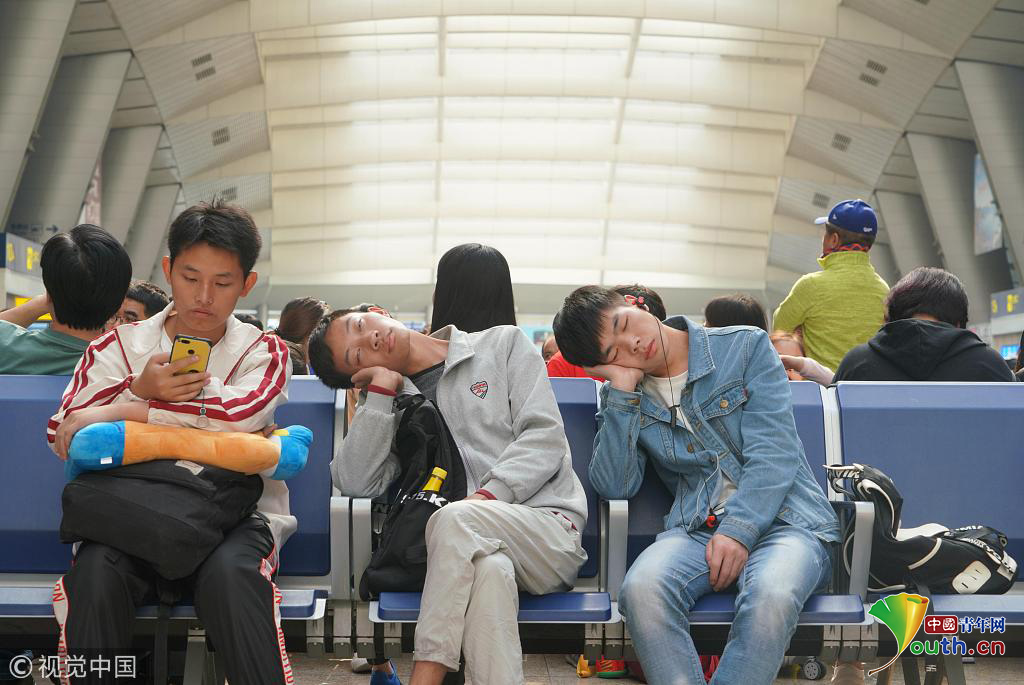 2018年10月1日,兩名旅客在北京南站內(nèi)候車時(shí)打盹。當(dāng)天是國慶假期首日,北京南站迎來客流高峰。此前,據(jù)北京鐵路局預(yù)計(jì),國慶黃金周將發(fā)送旅客1168萬人,同比增加19.9萬人。其中10月1日為出行高峰日,預(yù)計(jì)當(dāng)天發(fā)送旅客143萬人,同比增加4.7萬人。圖片作者:張興龍