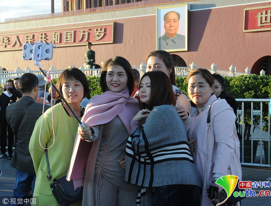 游客著秋冬裝天安門廣場合影。