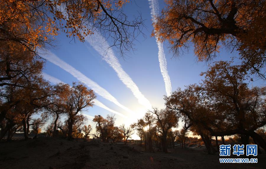 這是在內(nèi)蒙古自治區(qū)額濟納旗拍攝的胡楊林(10月10日攝)。 金秋時節(jié),內(nèi)蒙古自治區(qū)額濟納旗胡楊林如同披上金裝,成為大漠中的一抹亮色,吸引眾多中外游客前來觀賞游玩。 新華社記者安希雅攝