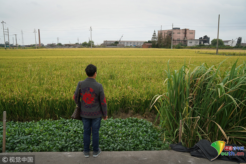 2018年10月14日,浙江嘉興嘉善縣陶莊,張娟芬(何永妹)家的草房子早沒有了,原址現(xiàn)在是一個(gè)小工廠,周圍是農(nóng)田。垂下的稻穗飽滿發(fā)黃,等待收割。圖片作者:田建明