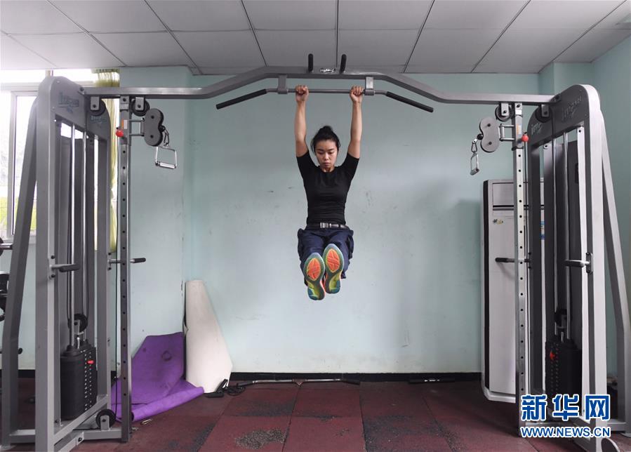 10月16日,湯春燕在健身房?jī)?nèi)進(jìn)行擒敵訓(xùn)練。