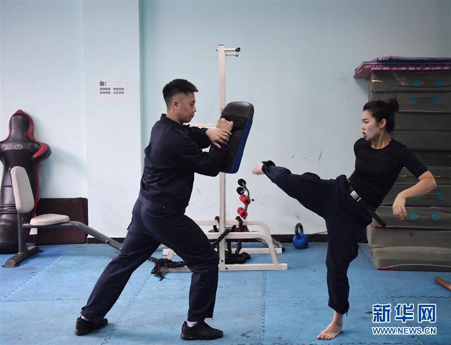 10月16日,湯春燕在健身房內(nèi)進行擒敵訓(xùn)練。 新華社記者王全超攝