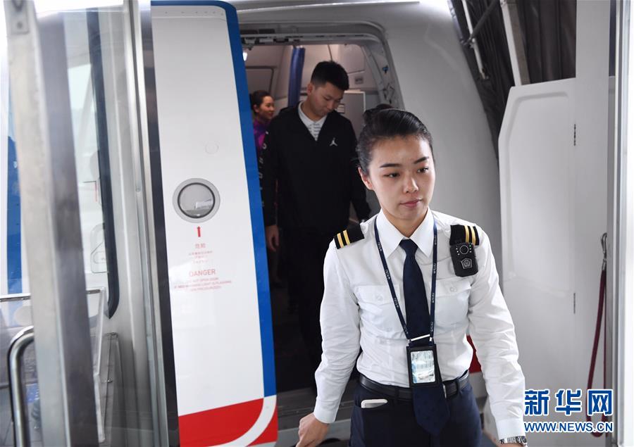 10月16日,航班抵達(dá)重慶江北國際機(jī)場后,湯春燕第一個(gè)走出艙門,準(zhǔn)備迎接旅客下機(jī)。 新華社記者王全超攝