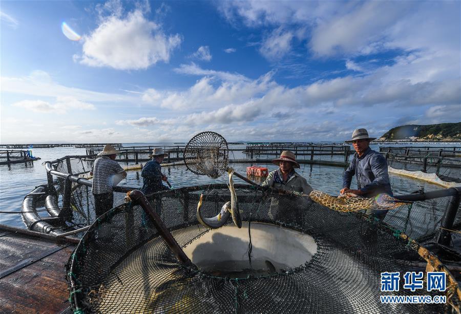 8月18日,南麂島海域內(nèi)的“海上牧場”養(yǎng)殖區(qū)內(nèi),漁民正捕撈大黃魚,處于仿生養(yǎng)殖環(huán)境的大黃魚需要生長2至3年。進入8月,浙江省溫州市平陽縣南麂鎮(zhèn)海域上大片的大黃魚、貽貝等特色海產(chǎn)品養(yǎng)殖區(qū)域迎來豐收季節(jié),養(yǎng)殖戶們駕駛漁船在養(yǎng)殖區(qū)海域進行打撈收獲,在碧海藍(lán)天下構(gòu)成了一幅“海上牧場”的美麗豐收景象。近年來,南麂鎮(zhèn)政府引導(dǎo)漁民養(yǎng)殖戶充分發(fā)揮“靠海吃?!钡馁Y源優(yōu)勢,大力發(fā)展海洋養(yǎng)殖經(jīng)濟和海島旅游經(jīng)濟,實現(xiàn)了南麂由“生態(tài)美”向“產(chǎn)業(yè)美”,“產(chǎn)業(yè)美”向“經(jīng)濟美”的轉(zhuǎn)變。同時該鎮(zhèn)堅持以大黃魚、貽貝等為特色產(chǎn)業(yè)支撐,精準(zhǔn)發(fā)展高效海洋養(yǎng)殖業(yè),重點培養(yǎng)一批新型職業(yè)漁民,依靠專業(yè)技術(shù)支持,實現(xiàn)深海仿生養(yǎng)殖,讓好生態(tài)造就好品質(zhì),重點打造南麂養(yǎng)殖品牌,組建營銷網(wǎng)絡(luò),拓展特色海產(chǎn)品市場。新華社記者 徐昱攝