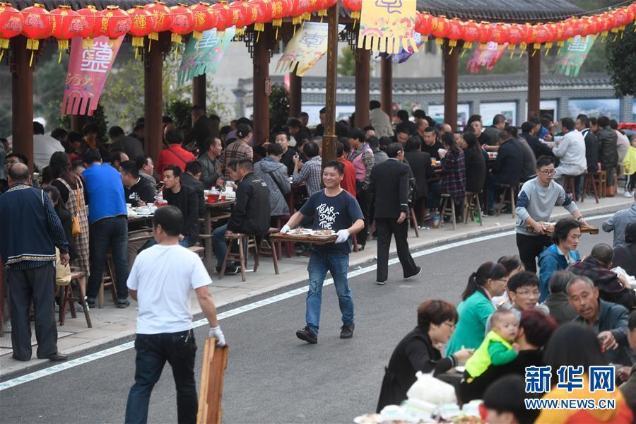 10月17日,村民與賓客在龍峰民族村參加“長(zhǎng)桌宴”。 當(dāng)日,在浙江省桐廬縣莪山畬族鄉(xiāng)龍峰民族村,一百桌宴席沿道路擺成一字長(zhǎng)蛇陣,四方賓客和當(dāng)?shù)卮迕褚黄鹌穱L著具有畬族特色的菜肴,場(chǎng)面頗為壯觀。 新華社記者 黃宗治 攝