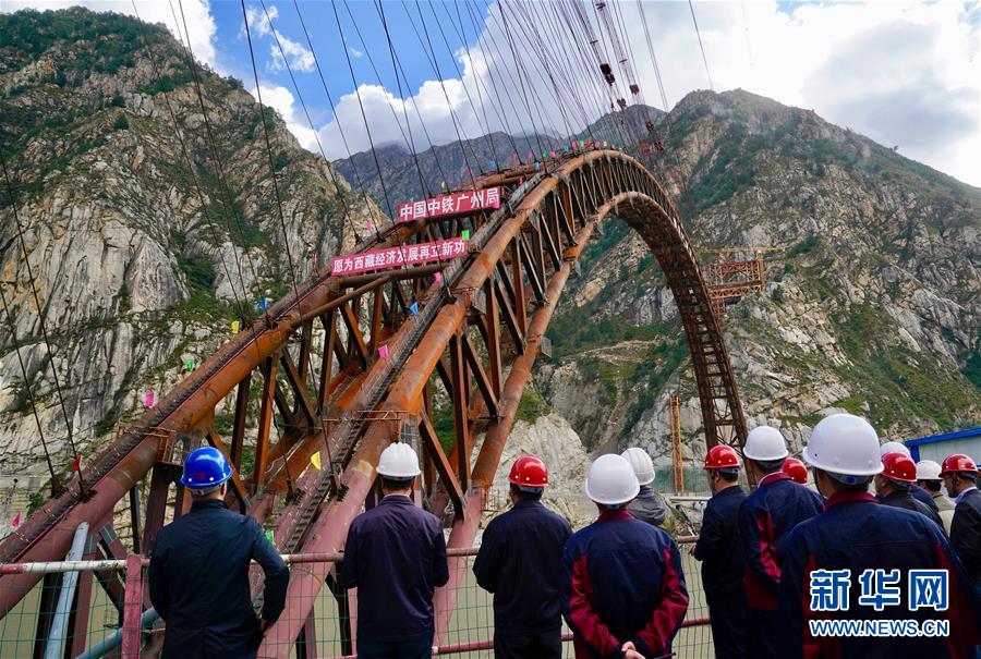 9月28日拍攝的川藏鐵路拉林段重點(diǎn)標(biāo)志性工程藏木特大橋。 當(dāng)日,隨著最后一節(jié)鋼管拱的對(duì)位和鎖定完畢,川藏鐵路拉林段藏木特大橋成功合龍,標(biāo)志著大橋主體結(jié)構(gòu)施工取得了關(guān)鍵性勝利。藏木特大橋由中國(guó)中鐵廣州局集團(tuán)承建,拱高112米,橋橫跨雅魯藏布江峽谷,水深66米。 新華社記者普布扎西攝