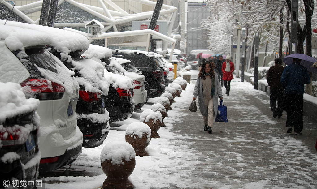 10月18日,行人穿行在烏魯木齊積雪覆蓋的人行道上。當日,新疆烏魯木齊迎來一場降雪。 新華社記者 江文耀 攝