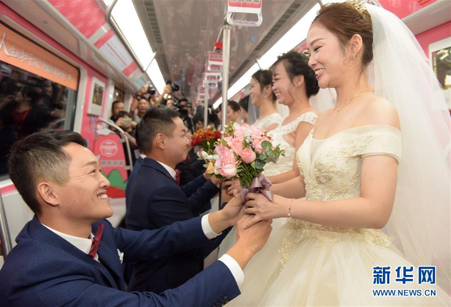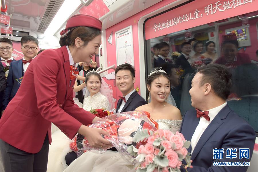 10月18日,在合肥市地鐵一號(hào)線(xiàn),新人們準(zhǔn)備乘坐地鐵。當(dāng)日,中鐵四局集團(tuán)城市軌道交通工程分公司的18對(duì)新人在安徽合肥地鐵一號(hào)線(xiàn)的車(chē)廂里舉行了一場(chǎng)集體婚禮儀式。 新華社記者 郭晨 攝