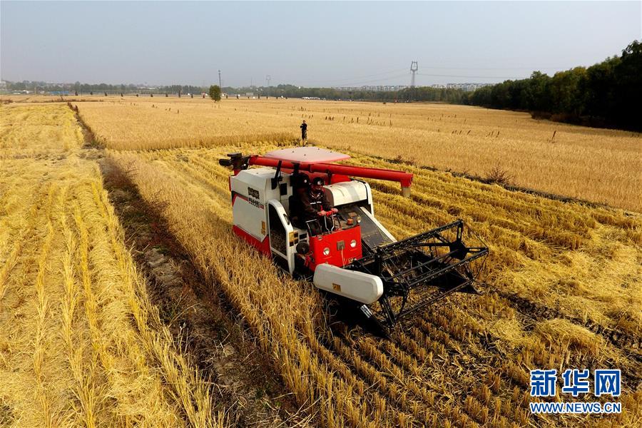 在太原市晉源區(qū)赤橋村,收割機(jī)在稻田里作業(yè)(10月17日無(wú)人機(jī)拍攝)。近日,山西省太原市晉源區(qū)2000多畝水稻迎來(lái)收割季。 金秋時(shí)節(jié),農(nóng)民們忙著收獲成熟的農(nóng)作物,喜迎豐收。 新華社記者 詹彥 攝
