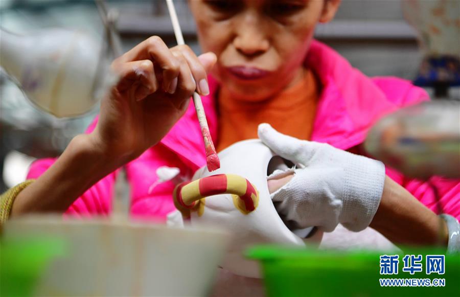 10月23日,德化順美陶瓷有限公司工人在生產線上給陶壺上色。 新華社記者魏培全攝