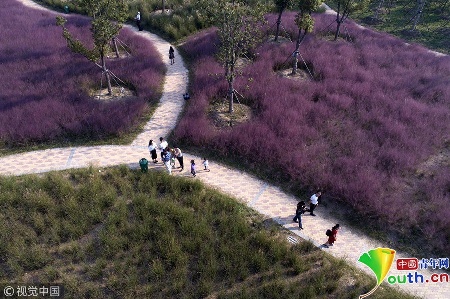 游客在生態(tài)樂園粉黛亂子草和風車前留影。