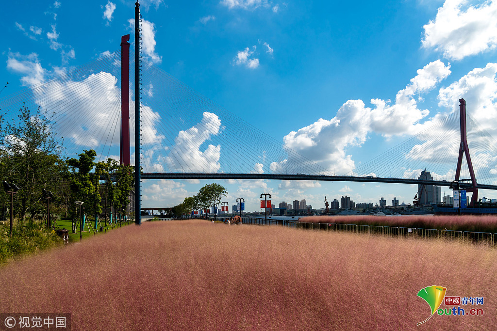 2018年9月28日,上海,東外灘楊浦濱江的粉黛亂子草目前已進(jìn)入盛花期,當(dāng)日早間,不少市民來(lái)到濱江拍照賞景,成片的紫色花海在藍(lán)天白云映襯下美不勝收。圖片作者:王岡/視覺中國(guó)