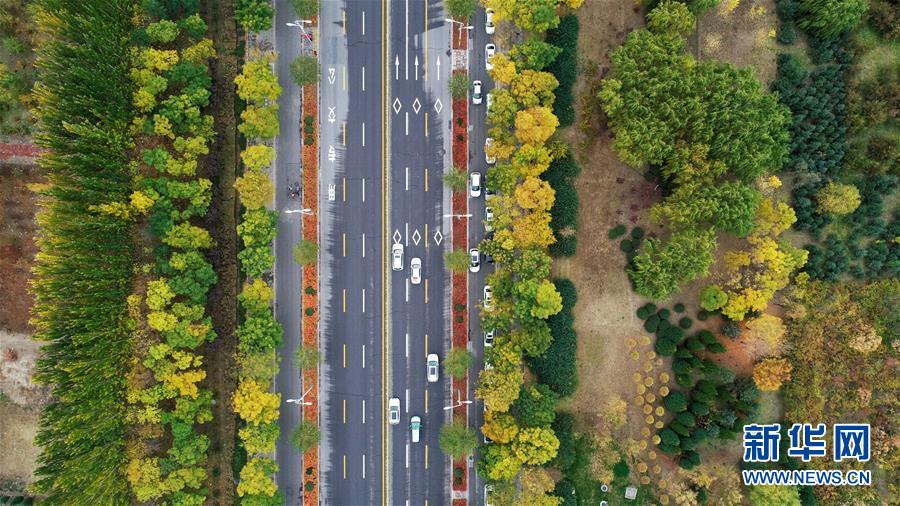 寧夏銀川市鳳凰公園秋景(10月20日無人機(jī)拍攝)。
