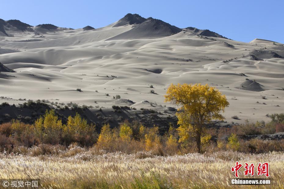 10月6日,甘肅酒泉,位于庫木塔格沙漠東緣的大峽谷被金黃的胡楊裝點出絢爛的秋色。 圖片來源:視覺中國