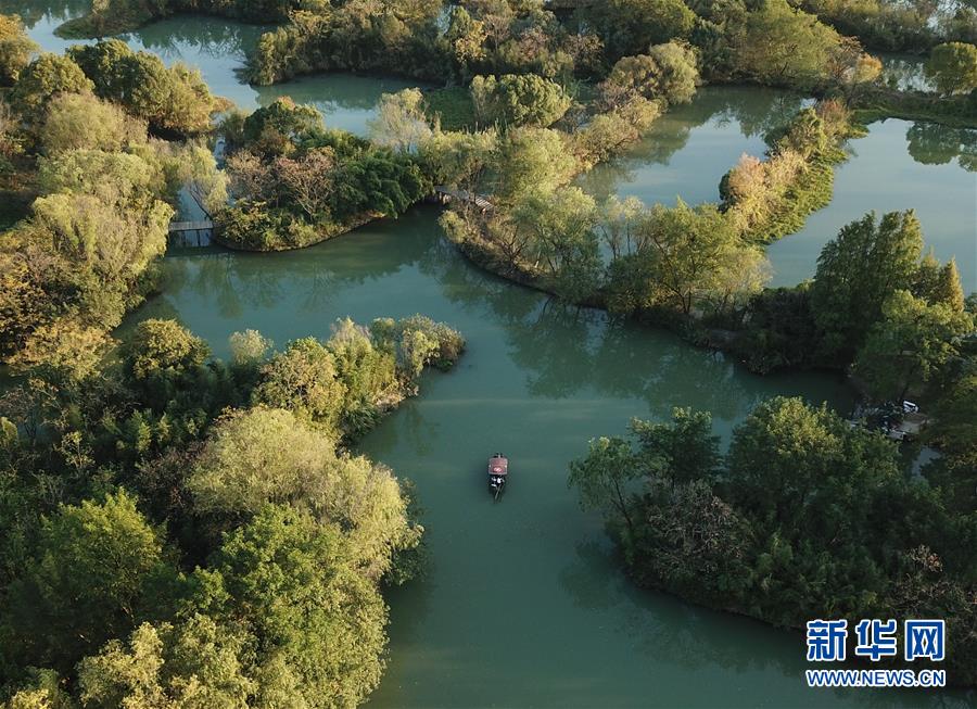 10月29日,游船行駛在西溪濕地河道上(無人機(jī)拍攝)。 新華社記者翁忻旸攝