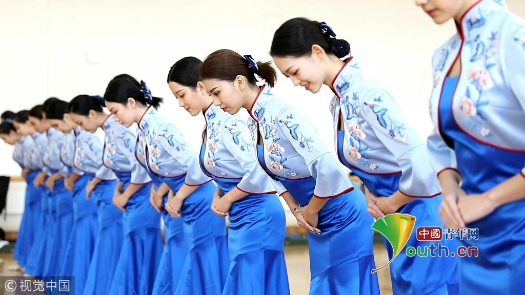 2018年10月15日,杭州,第五屆世界互聯(lián)網(wǎng)大會召開在即,來自浙江傳媒學(xué)院的禮儀志愿者們正在進行緊張有序的集中訓(xùn)練。圖片作者:浙江日報 馮賀/視覺中國