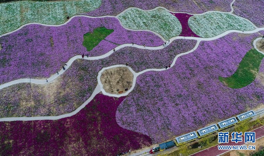 11月2日,游客乘坐觀光小火車觀賞“五彩花?!保o人機拍攝)。
