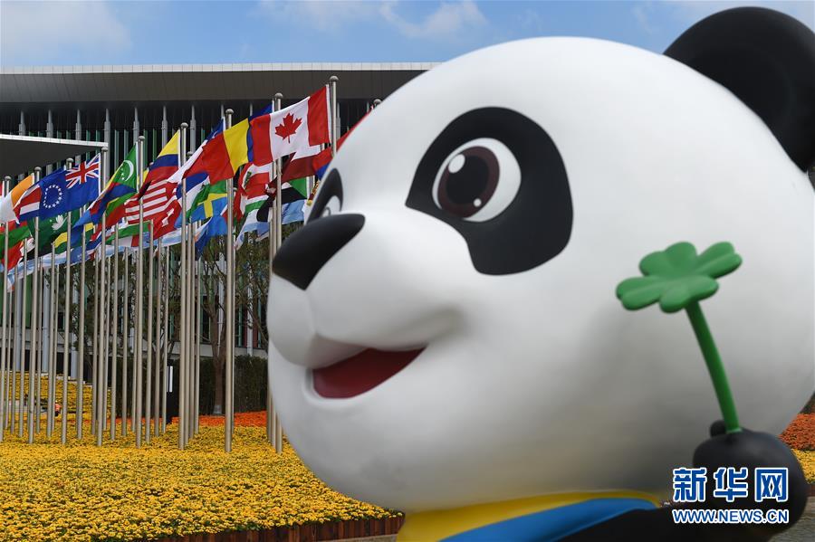 首屆中國國際進(jìn)口博覽會吉祥物“進(jìn)寶”在博覽會舉辦場地——國家會展中心(上海)歡迎來賓(11月4日攝)。首屆中國國際進(jìn)口博覽會即將在上海開幕。美麗的上海張開懷抱,迎接八方來客。 新華社記者 韓瑜慶 攝