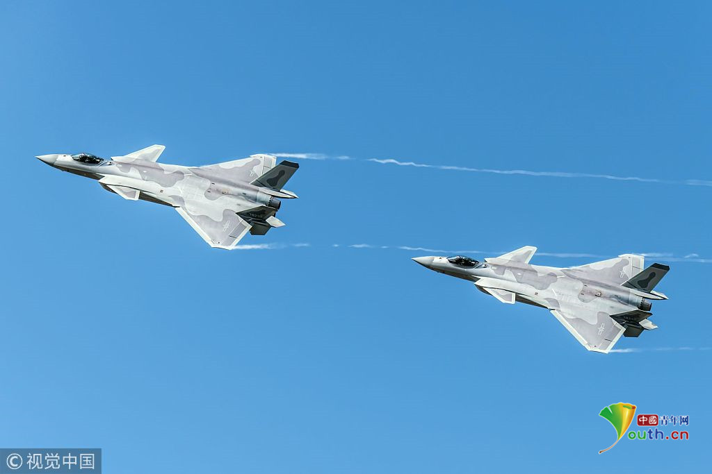 圖七:2018年11月6日,廣東珠海航展上,兩架殲-20戰(zhàn)機(jī)組成雙機(jī)編隊(duì)進(jìn)行飛行表演。