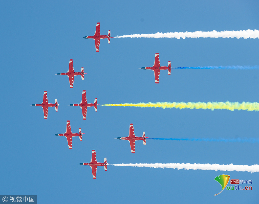 2018年11月7日,廣東珠海,第12屆珠海航展在金灣機(jī)場如火如荼進(jìn)行。空軍航空大學(xué)“紅鷹”飛行表演隊(duì)在第十二屆中國航展進(jìn)行了飛行表演,展示了飛行員精湛的飛行技能。視覺中國