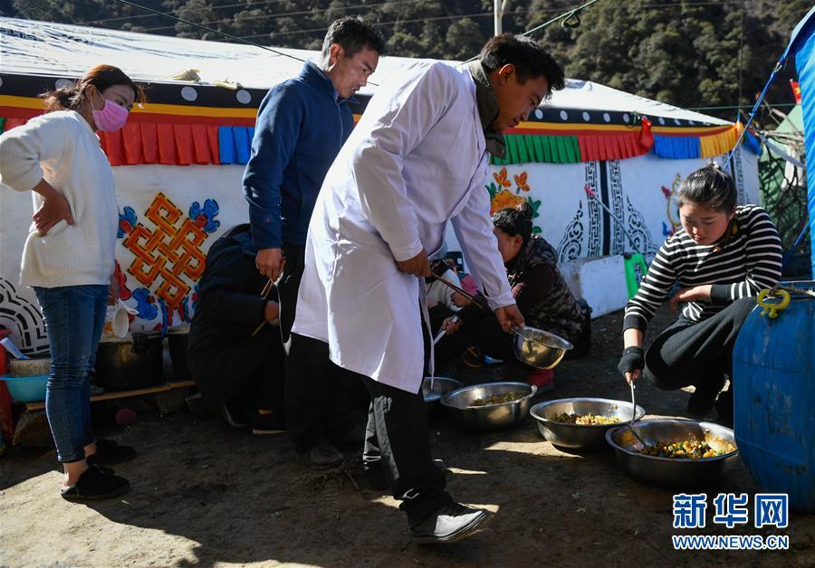 11月12日,在西藏昌都市江達(dá)縣波羅鄉(xiāng)康扎西安置點(diǎn),工作人員在臨時(shí)廚房打飯。 西藏自治區(qū)江達(dá)縣波羅鄉(xiāng)康扎西安置點(diǎn),離波羅鄉(xiāng)政府直線距離約3公里,位于一處地勢(shì)開(kāi)闊平緩的山谷中,比堰塞湖水面高出100多米。10月11日金沙江白格段山體滑坡發(fā)生后,當(dāng)?shù)鼐驮谶@里設(shè)立了安置點(diǎn),安置附近受災(zāi)群眾。 新華社記者 劉東君 攝