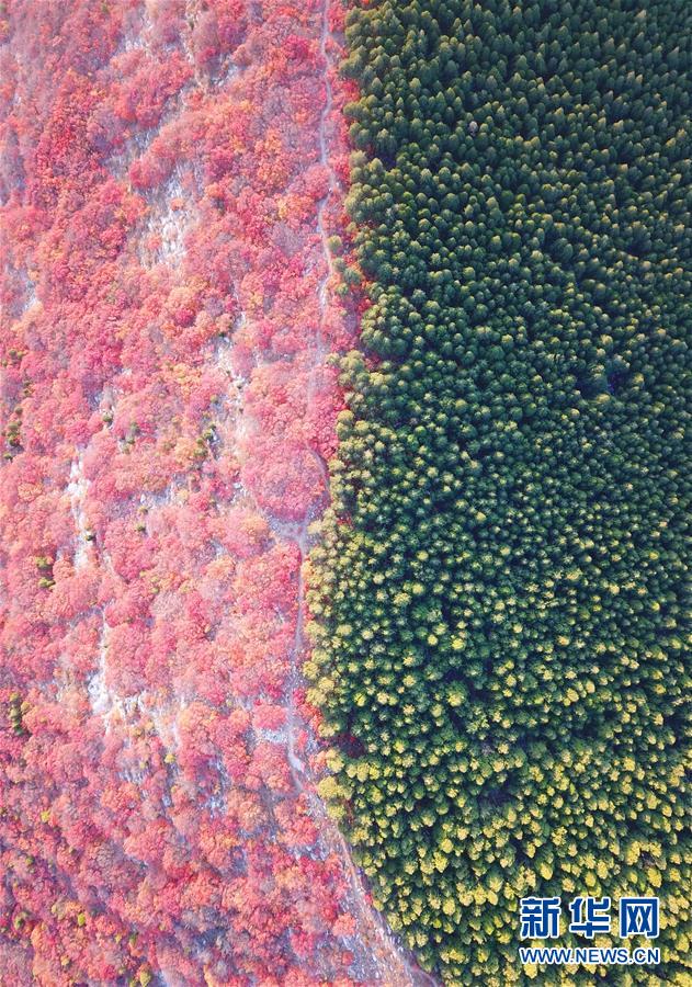 這是山東濟南楔子山色彩分明的樹林(10月31日無人機拍攝)。 新華社記者朱崢攝