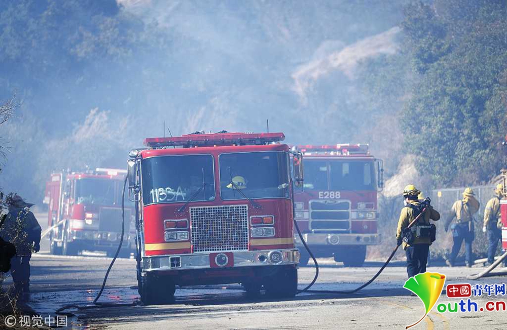 該郡第二大城市千橡樹市(Thousand Oaks)等很多地方房屋被毀,高速公路封閉,居民緊急疏散。洛杉磯郡圣蓋博市(San Gabriel)警察局警官日瓦戈(O. Zhivaga)和同事們當(dāng)天清晨即受命馳援文圖拉郡,保護(hù)當(dāng)?shù)鼐用窈拓?cái)產(chǎn)安全。圖為消防車行駛在已封閉的公路上,天空中濃煙滾滾。
