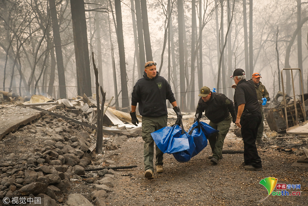 當(dāng)?shù)貢r間2018年11月10日至11月11日,美國加州Paradise,當(dāng)?shù)厣交鹚僚?,治安官們在?zāi)區(qū)搜尋遇難者遺體。圖片作者:Gabrielle Lurie