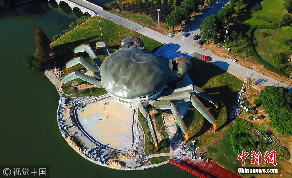 2017年10月31日,江蘇省昆山市巴城巴解園內的東陽澄湖岸邊,一只青背白肚金爪黃毛,長75米,高約16米的蘇州陽澄湖“超級大閘蟹”栩栩如生。圖片來源:視覺中國