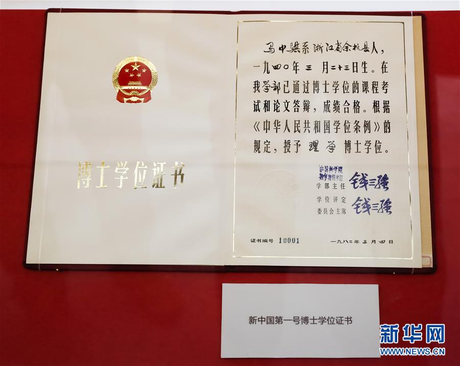 這是在“歷史巨變”展區(qū)拍攝的新中國第一號博士學位證書(11月15日攝)。