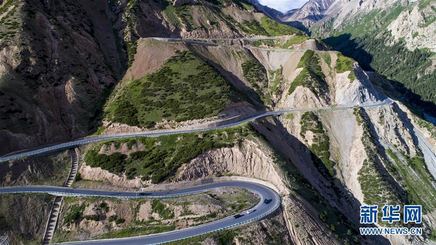 連續(xù)轉(zhuǎn)彎的獨(dú)庫(kù)公路盤山道(2017年7月15日無(wú)人機(jī)拍攝)。 新華社記者 江文耀 攝