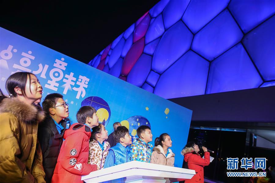 11月20日,在北京舉行的世界兒童日主題活動(dòng)上,孩子們共同點(diǎn)亮國家游泳中心外墻。 新華社記者張玉薇攝