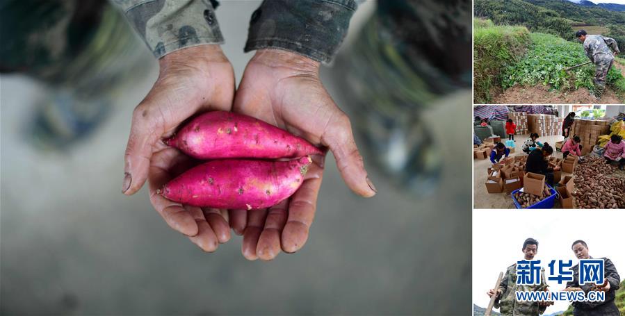 拼版照片:左圖為在大浪鎮(zhèn)桐里村,55歲的韋炳莊手捧剛剛收獲的高山紅薯;右上圖為韋炳莊在地里挖紅薯;右中圖為在縣城一個電商基地里,工作人員打包貧困戶種植的紅薯,準備發(fā)往全國各地;右下圖為韋炳莊(左)在地里挖紅薯(照片均攝于11月18日)。今年,韋炳莊種植3畝高山紅薯,每畝年產(chǎn)3000多斤,他家已于2016年實現(xiàn)脫貧。 廣西融水苗族自治縣是國家扶貧工作重點縣,全縣“九山半水半分田”,生活生產(chǎn)環(huán)境較為惡劣,脫貧攻堅任務艱巨,目前還有7.68萬貧困人口。面對經(jīng)濟發(fā)展落后、貧困面廣且程度深的現(xiàn)狀,當?shù)匕衙撠毠耘c創(chuàng)新產(chǎn)業(yè)扶持相結(jié)合,依托生態(tài)資源優(yōu)勢,實施“特色產(chǎn)業(yè)富民行動”,通過發(fā)展特色民族旅游、林下經(jīng)濟和特色養(yǎng)殖業(yè)等扶貧產(chǎn)業(yè),帶動貧困群眾依靠勤勞的雙手,拔窮根摘窮帽,實現(xiàn)脫貧致富。據(jù)了解,目前全縣貧困戶參與特色產(chǎn)業(yè)發(fā)展的有2.9萬戶,扶貧產(chǎn)業(yè)覆蓋率達95%。 新華社記者 黃孝邦 攝