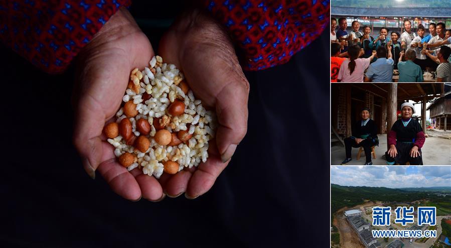 拼版照片:左圖為在廣西融水雙龍溝森林旅游度假區(qū)夢嗚苗寨,70歲的韋院媽手捧油茶原料:花生、油果、蔭米(11月20日攝);右上圖為韋院媽(左六)在景區(qū)里和游客們一起歡度苗族新禾節(jié)(7月18日攝);右中圖為韋院媽(右)在家里休息(11月20日攝);右下圖為夢嗚苗寨(7月19日無人機拍攝)。韋院媽是桿洞鄉(xiāng)錦洞村的貧困戶,今年3月,她和村里的13戶貧困戶一起舉家搬到雙龍溝森林旅游度假區(qū)打造的夢嗚苗寨,景區(qū)將貧困戶引入苗寨生活工作,保證貧困家庭有穩(wěn)定的收入。 廣西融水苗族自治縣是國家扶貧工作重點縣,全縣“九山半水半分田”,生活生產(chǎn)環(huán)境較為惡劣,脫貧攻堅任務(wù)艱巨,目前還有7.68萬貧困人口。面對經(jīng)濟發(fā)展落后、貧困面廣且程度深的現(xiàn)狀,當?shù)匕衙撠毠耘c創(chuàng)新產(chǎn)業(yè)扶持相結(jié)合,依托生態(tài)資源優(yōu)勢,實施“特色產(chǎn)業(yè)富民行動”,通過發(fā)展特色民族旅游、林下經(jīng)濟和特色養(yǎng)殖業(yè)等扶貧產(chǎn)業(yè),帶動貧困群眾依靠勤勞的雙手,拔窮根摘窮帽,實現(xiàn)脫貧致富。據(jù)了解,目前全縣貧困戶參與特色產(chǎn)業(yè)發(fā)展的有2.9萬戶,扶貧產(chǎn)業(yè)覆蓋率達95%。 新華社記者 黃孝邦 攝