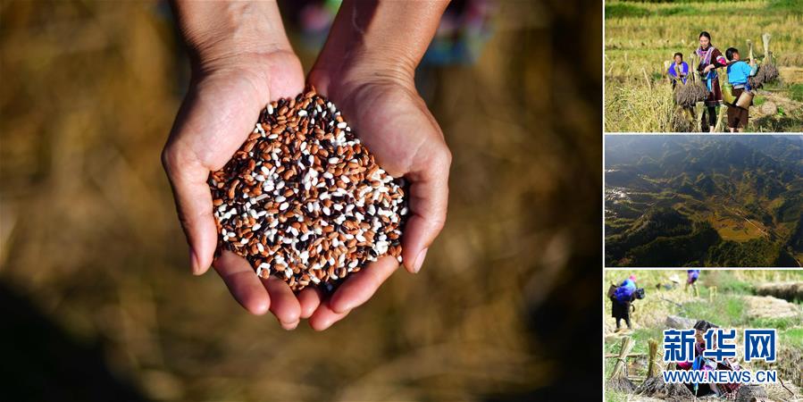 拼版照片:左圖為在安太鄉(xiāng)元寶村,合作社負(fù)責(zé)人謝秀萍手捧今年收獲的三色香糯;右上圖為合作社負(fù)責(zé)人謝秀萍(中)和社員們在收香糯;右中圖為位于苗山深處的香糯種植基地;右下圖為謝秀萍在收香糯(照片均攝于10月30日)。謝秀萍是當(dāng)?shù)叵闩捶N植合作社負(fù)責(zé)人,帶動幾百戶貧困戶種植香糯。香糯是廣西融水大苗山的特產(chǎn),它生長在高寒高海拔的特殊自然環(huán)境中,產(chǎn)量少,營養(yǎng)價值高。 廣西融水苗族自治縣是國家扶貧工作重點縣,全縣“九山半水半分田”,生活生產(chǎn)環(huán)境較為惡劣,脫貧攻堅任務(wù)艱巨,目前還有7.68萬貧困人口。面對經(jīng)濟發(fā)展落后、貧困面廣且程度深的現(xiàn)狀,當(dāng)?shù)匕衙撠毠耘c創(chuàng)新產(chǎn)業(yè)扶持相結(jié)合,依托生態(tài)資源優(yōu)勢,實施“特色產(chǎn)業(yè)富民行動”,通過發(fā)展特色民族旅游、林下經(jīng)濟和特色養(yǎng)殖業(yè)等扶貧產(chǎn)業(yè),帶動貧困群眾依靠勤勞的雙手,拔窮根摘窮帽,實現(xiàn)脫貧致富。據(jù)了解,目前全縣貧困戶參與特色產(chǎn)業(yè)發(fā)展的有2.9萬戶,扶貧產(chǎn)業(yè)覆蓋率達95%。 新華社記者 黃孝邦 攝
