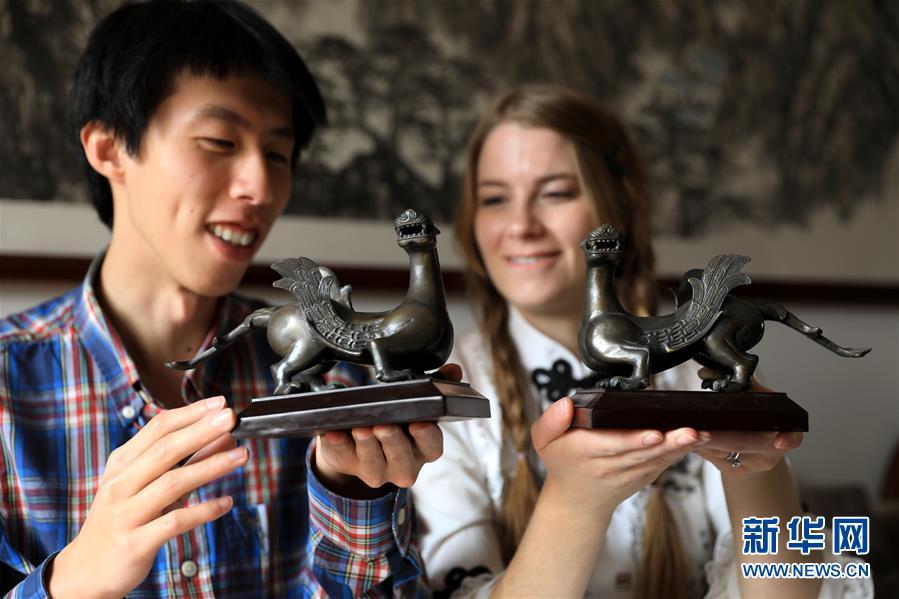 11月24日,在石家莊橋西區(qū)家中,艾米莉在聽愛人郭了達(dá)介紹中國歷史文化。 新華社記者 呂優(yōu) 攝