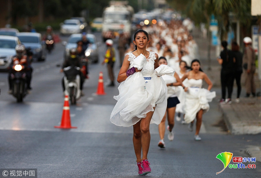 當(dāng)?shù)貢r(shí)間2018年11月24日,泰國(guó)曼谷舉辦新娘賽跑活動(dòng),獲勝者將獲得婚禮的全額資助,眾多新娘在街頭提裙狂奔。圖片來(lái)源:視覺(jué)中國(guó)
