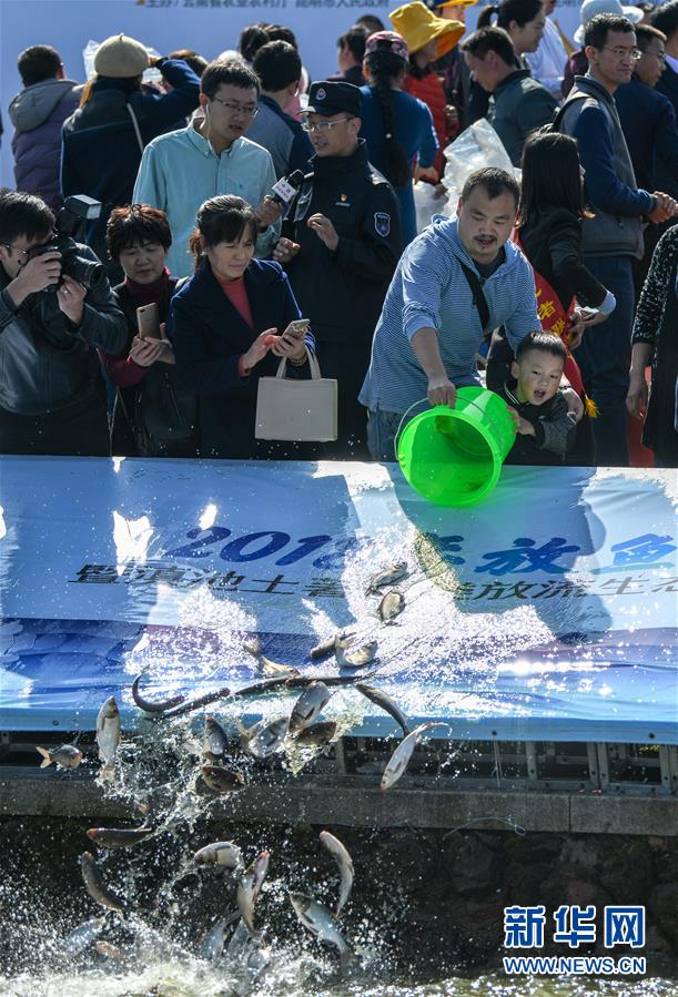 當(dāng)日,“2018放魚滇池暨滇池土著魚類放流生態(tài)保護行動”在昆明滇池湖畔舉行,包括20萬尾滇池金線鲃、云南光唇魚在內(nèi)的滇池土著魚類以及5萬余尾鰱、鳙魚在滇池放流。 據(jù)統(tǒng)計,滇池最多的時候生活著24種土著魚,目前除了銀白魚自然存在外,2010年實現(xiàn)了滇池金線鲃的人工增殖放流,2017年又讓云南光唇魚實現(xiàn)了回歸。 新華社記者江文耀攝