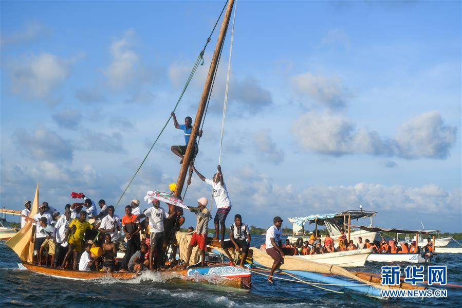 11月24日,在肯尼亞東部印度洋上,贏得獨(dú)桅三角帆船比賽的拉穆居民慶祝勝利。這種帆船曾是東非海洋貿(mào)易的主要交通工具,拉穆本地居民至今還以能駕馭三角帆船為榮。